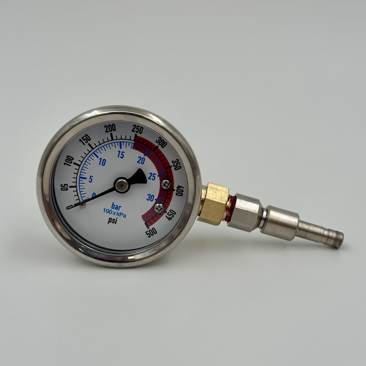 Replacement for Removable Pressure Gauge. To use as a pressure tester, either unscrew a slimline nozzle tip from its adapter and screw in the gauge, or insert the assembly into a tee, then run a mist.